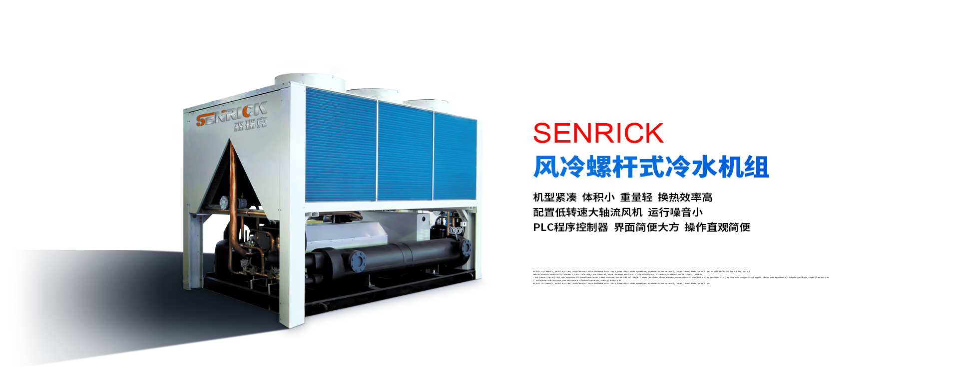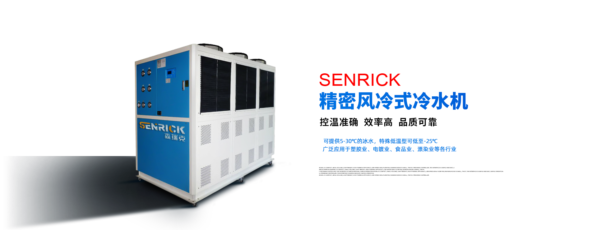 森瑞克機(jī)械(蘇州)有限公司(簡稱:SENRICK)是一家中外合作性企業(yè),引進(jìn)技術(shù),專注于工業(yè)制冷設(shè)備,工業(yè)溫控設(shè)備,非標(biāo)制冷設(shè)備,集激光,化工,真空設(shè)備輔機(jī)等集研發(fā)、生產(chǎn)、銷售、服務(wù)于一體的的現(xiàn)代化科技企業(yè)。公司擁有完善的制造設(shè)備,先進(jìn)的檢測系統(tǒng),獨立的加工、生產(chǎn)工藝,一支開拓創(chuàng)新專業(yè)有素的技術(shù)人才團(tuán)隊,以及全面的質(zhì)量控制體系,為產(chǎn)品質(zhì)量的不斷優(yōu)化提供了強(qiáng)大的保障,以確保滿足不同市場的各種需求。經(jīng)過多年的努力企業(yè)相繼研發(fā)生產(chǎn)出了工業(yè)冷水機(jī),工業(yè)冷風(fēng)機(jī),工業(yè)冷油機(jī),工業(yè)機(jī),低溫冷水機(jī),低溫冷風(fēng)機(jī),低溫冷油機(jī),螺桿式冷水機(jī)...